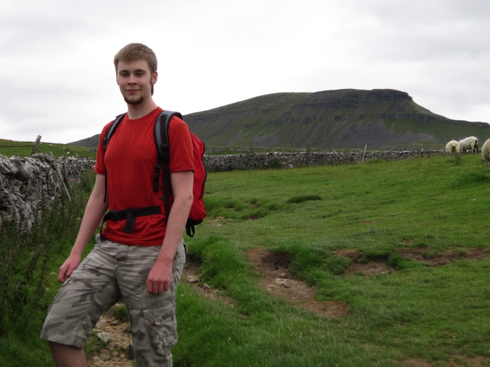 As we left the hotel, heading towards the church and the track up Pen-y-Ghent, we passed the public car park and loos where most folks made a last pit stop. As we waited, the rain started to come down. Waterproof over-trousers out of the pack and off we went, leaving Horton, heading up the road by the church towards Brackenbottom. The road has a gradual incline and just before you reach the farm there is a track to the left where the real walk starts. There is a constant uphill gradient, following the clear track onwards and upwards with Pen-y-Ghent out of sight, hidden by the rain and clouds.